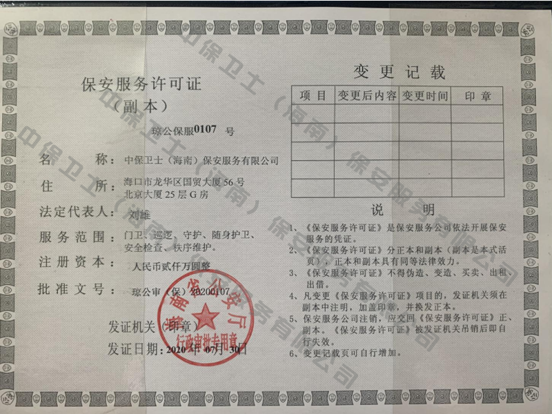 郑州刘强知识产权咨询有限公司是经海南省公安厅批准,依法持有《保安服务许可证》,提供保安服务、门卫、巡逻、守护、区域秩序维护、随身护卫、安全检查的专业化保安服务公司。